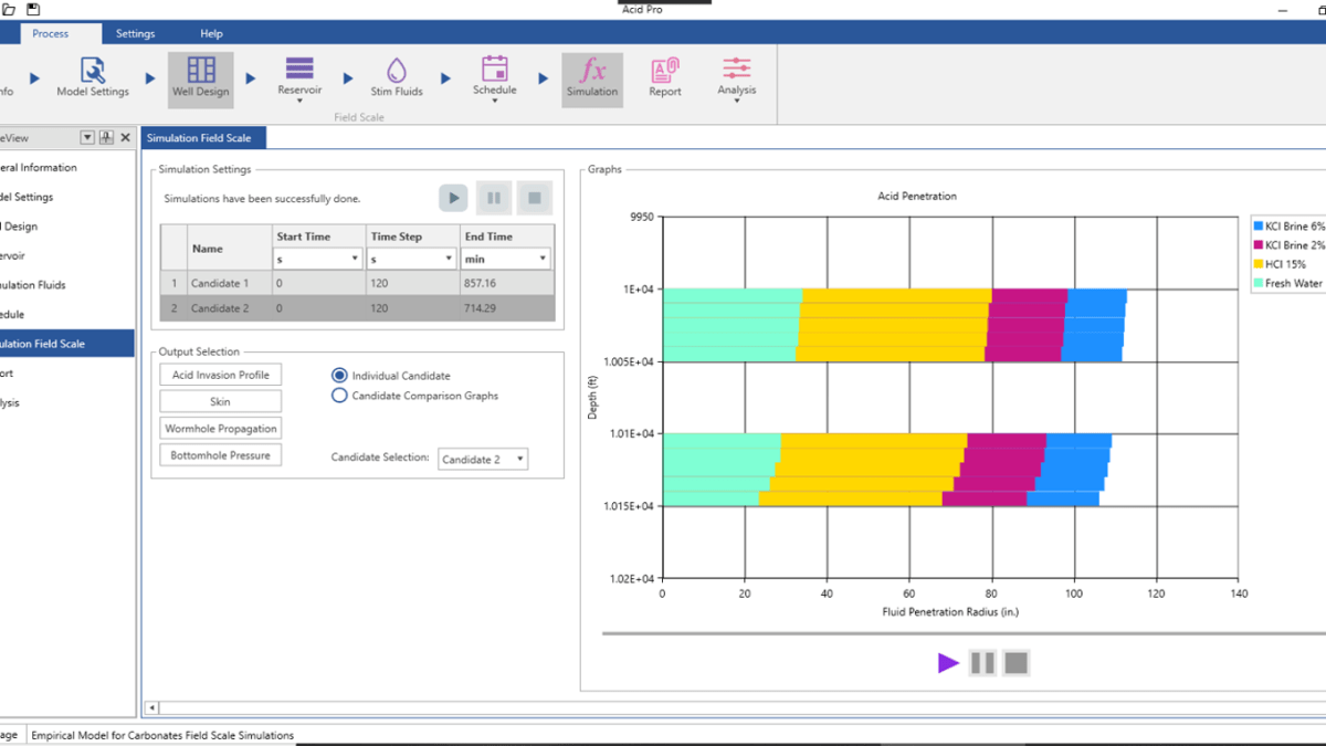 The acidizing process of oil and gas wells is carried out to address potential damages caused by various factors, resulting in improved production. Prior to the operational acidizing process, it is necessary to simulate and optimize the acidizing operations through design. Acid Pro acidizing software is used for modeling and designing well acidizing operations. This software is capable of predicting the acidizing process outcome based on valid solution algorithms and input data, including well, reservoir, and acidizing fluid information. The software is applicable to both carbonate and sandstone reservoirs. Furthermore, it can simulate the acidizing process at the reservoir scale, taking into account the distribution of rock properties (porosity, permeability, etc.) for identifying wormhole distribution, optimal acidizing rate, and design, as well as validating laboratory test results